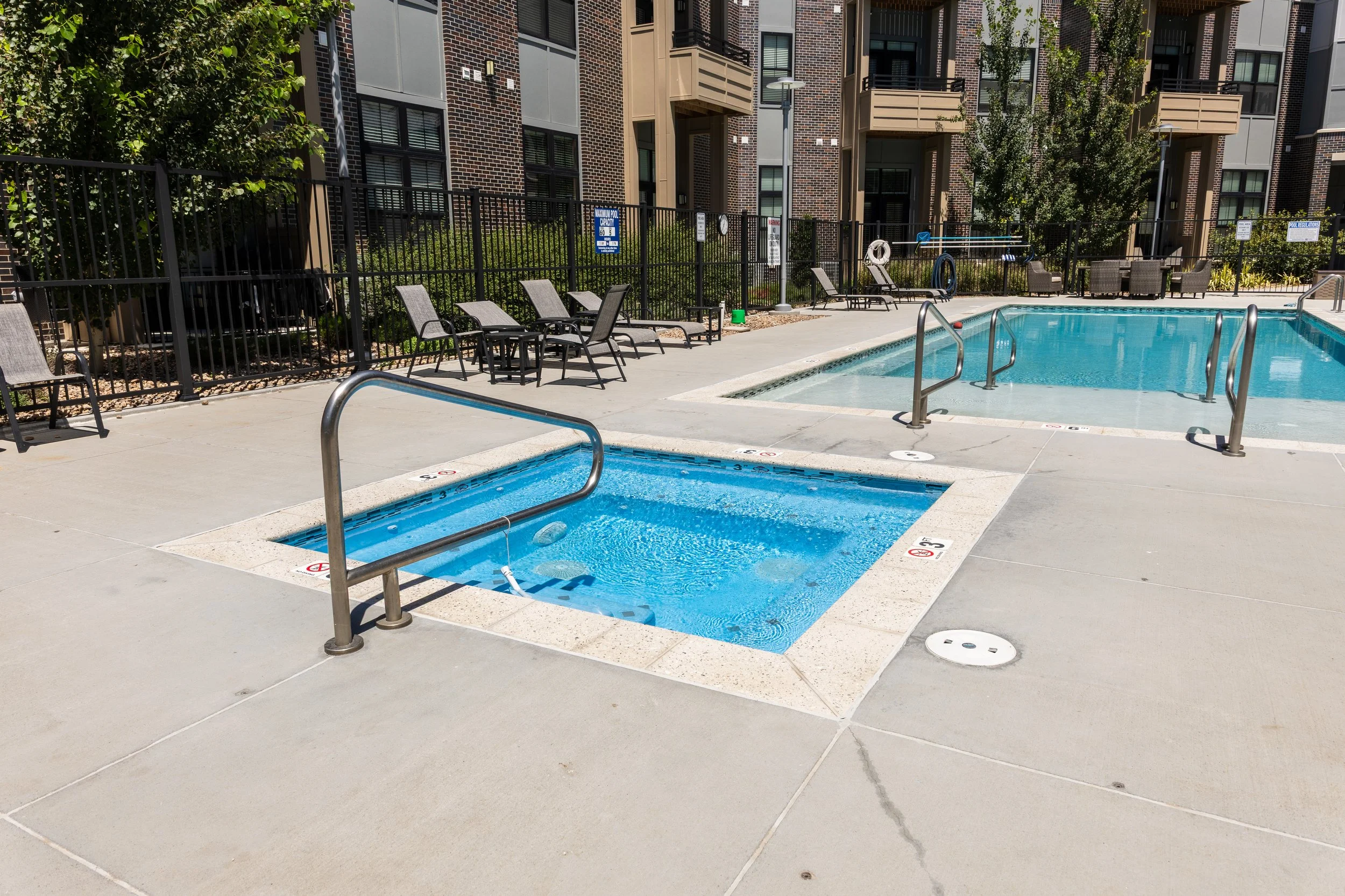 Dive into relaxation and leisure with exclusive pool and hot tub access. The gated pool area features ample seating with comfortable loungers, perfect for soaking up the sun.