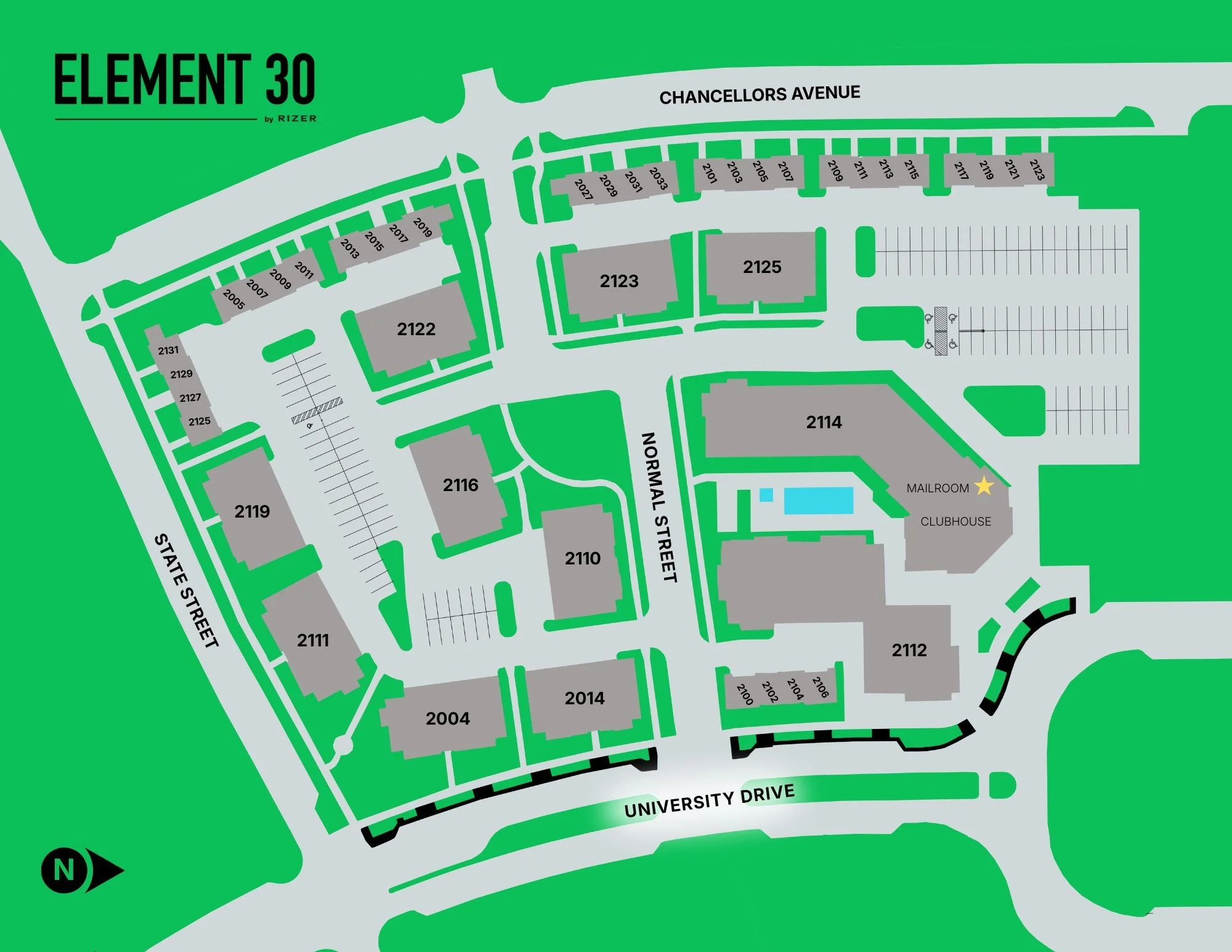 Deliveries for buildings 2112 and 2114 University Drive can be delivered to the mailroom. Deliveries for all other buildings can be delivered directly to the apartment doorstep. Please see the Element 30 community map for reference.